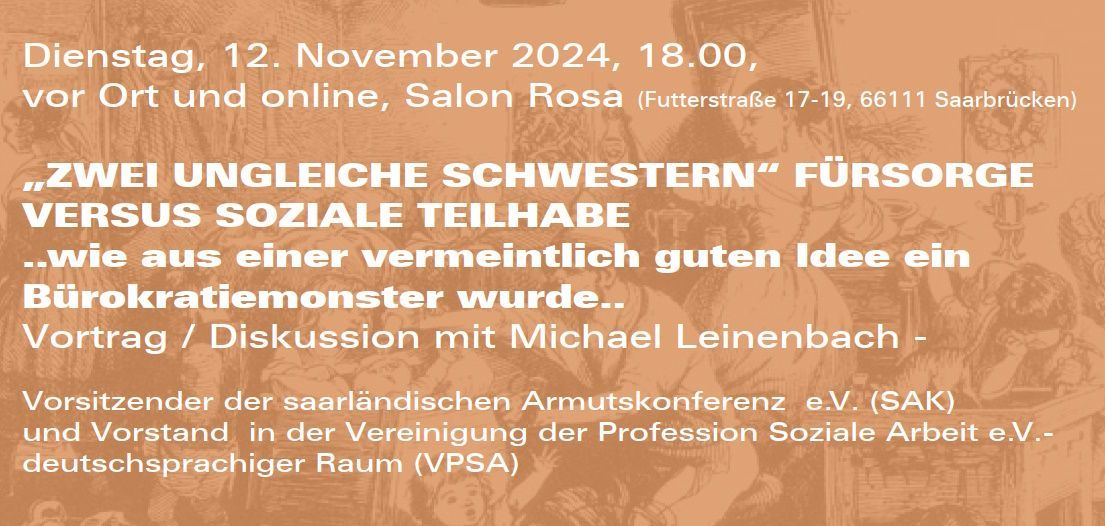Am Mittwoch, den 12.11.2024, 18.00 lädt die Peter Imandt Gesellschaft e.V./Rosa Luxemburg Stiftung Saar zu einem Vortrag mit Michael Leinenbach, dem Vorsitzenden der saarländischen Armutskonferenz e.V. (SAK) und Vorstand in der Vereinigung der Profession Soziale Arbeit e.V.- deutschsprachiger Raum (VPSA) in den Salon Rosa, Futterstraße 17-19, 66111 Saarbrücken ein!